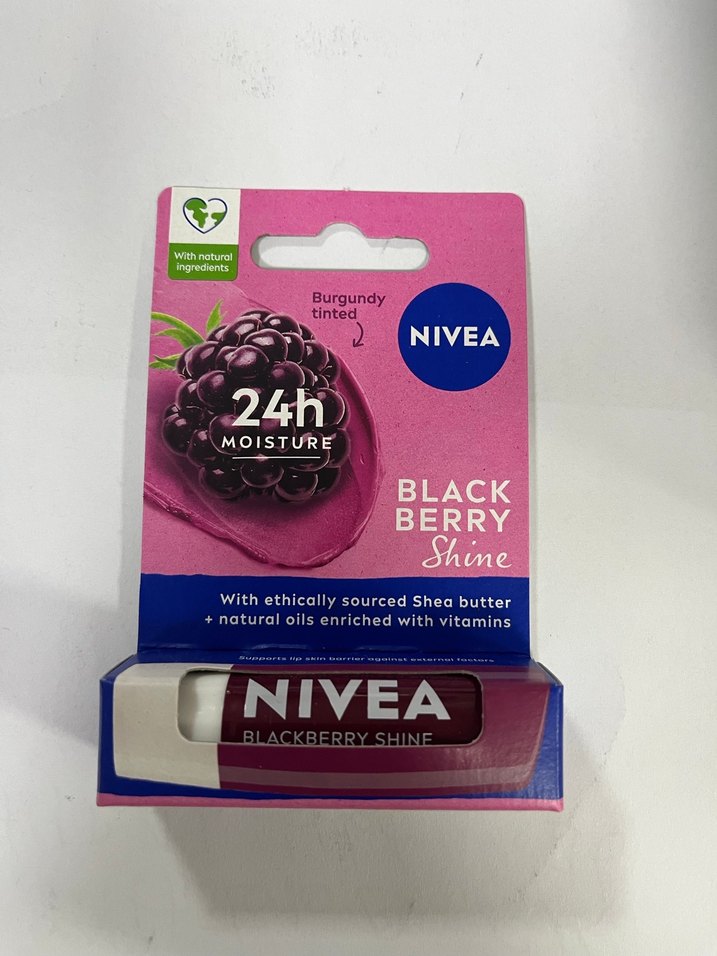 Nivea Blackberry Shine dudak balmı, etik olarak temin edilmiş shea yağı ve vitaminlerle zenginleştirilmiş doğal yağlarla 24 saat nem sağlar. Bordo tonlarında renk verir.