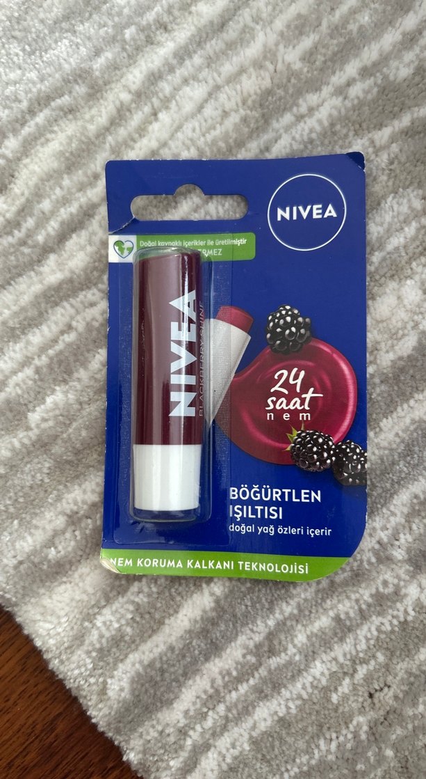 NIVEA böğürtlen ışıltısı dudak balmı, 24 saat nem sağlar ve doğal yağ özleri içerir, nem koruma kalkanı teknolojisine sahiptir.