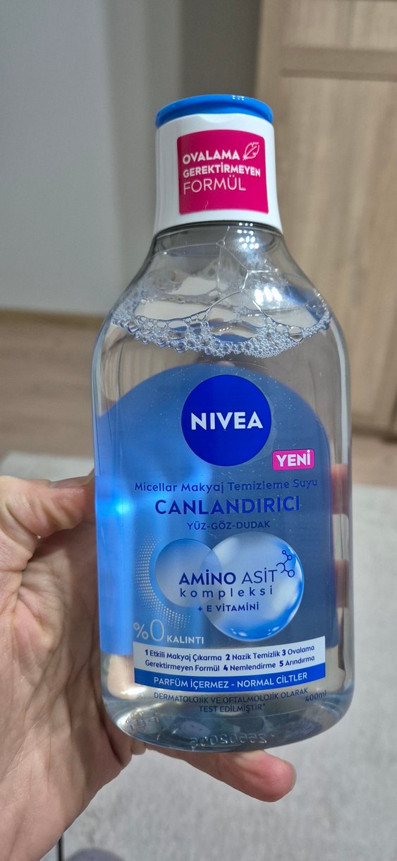 Nivea Canlandırıcı Micellar Makyaj Temizleme Suyu, amino asit kompleksi ve E vitamini ile yüz, göz ve dudakları ovma gerektirmeden temizler. Normal ciltler için, parfümsüz.