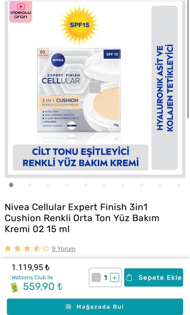 Nivea Cellular Expert Finish 3in1 Cushion açık bej tonunda, SPF 15, hyaluronik asit ve kolajen ile cilt tonunu eşitler ve bakım sağlar. Doğal bitiş ve nemlendirme sunar. 1 kere kullandım