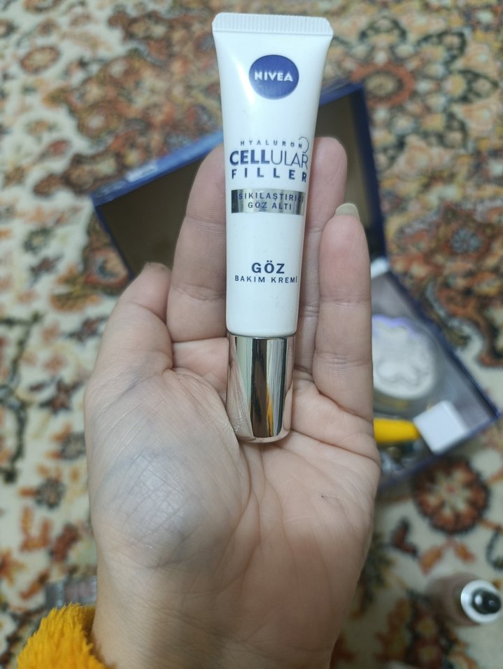 Nivea Cellular Filler göz bakım kremi, beyaz parlak tüpte. Hassas göz çevresini yenilemek ve bakım yapmak için kullanılır.