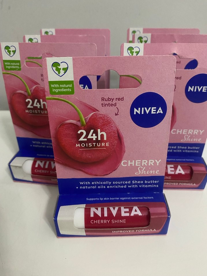 Nivea Cherry Shine dudak balmı, 24 saat nem sağlar ve ruby red renk verir. Etik olarak elde edilmiş shea yağı ve doğal yağlarla zenginleştirilmiştir, vitaminlerle cilt bariyerini destekler.