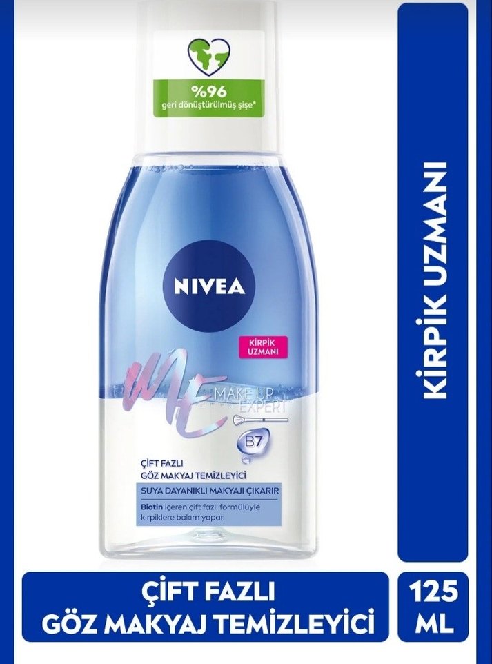 IVEA Make Up Expert Çift Fazlı Göz Makyaj Temizleyici 125ml: Makyaj yapmayı sevenler için özel olarak geliştirildi.Etkili Makyaj Temizleme: Mavi Kantaron Çiçeği ile zenginleştirilmiş formülüyle ovalama gerektirmeden suya dayanıklı maskarayı ve makyajı etkili bir şekilde çıkarır. Çift etkili formülü ile hassas kirpikleri korur ve kirğik bakımı yapar . %0 Makyaj Kalıntısı: Gözlerinizde yağlı kalıntı bırakmaz Ciltle ve gözle uyumu dermatolojik ve oftalmolojik olarak onaylanmıştır. Nasıl Kullanılır: Kullanmadan önce iyice çalkalayın. Ürünü pamuk üzerine uygulayın ve göz bölgesini içten dışa doğru nazikçe temizleyin. Kontakt lens kullanıcıları içi uygundur. #nivea #göz #makyajtemizleme #çiftbazlı