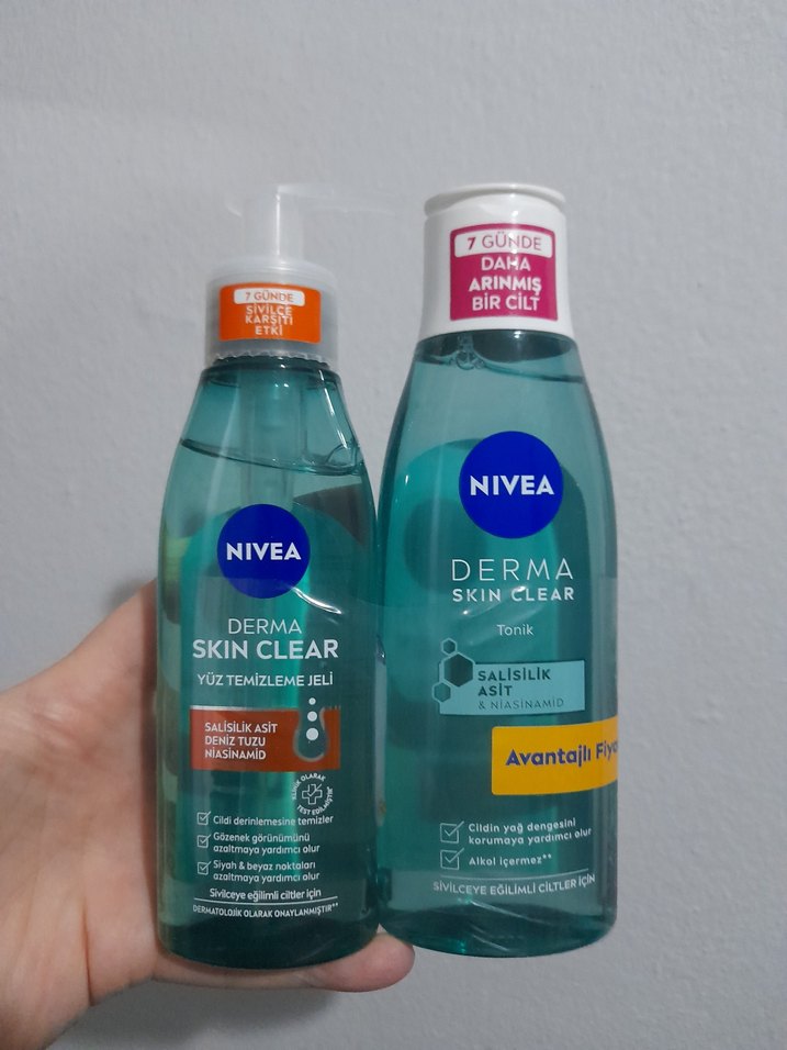 Nivea Derma Skin Clear yüz temizleme jeli ve tonik, salisilik asit içerir. Cildi derinlemesine temizler, yağ dengesini korur ve 7 günde daha arınmış bir cilt sağlar. Sıfır ürün SON fiyattır