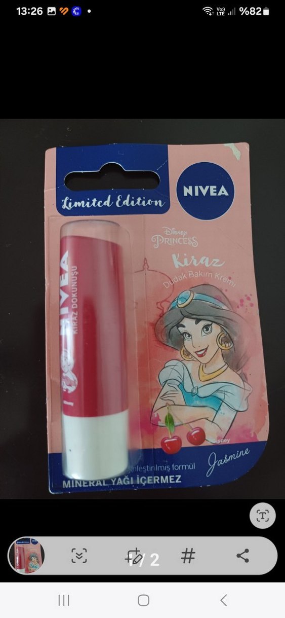 Nivea Disney Prenses Kiraz dudak bakım kremi, mineral yağı içermez ve dengeli formüllüdür. Pastel pembe renkte, Jasmine temalı sınırlı üretim.