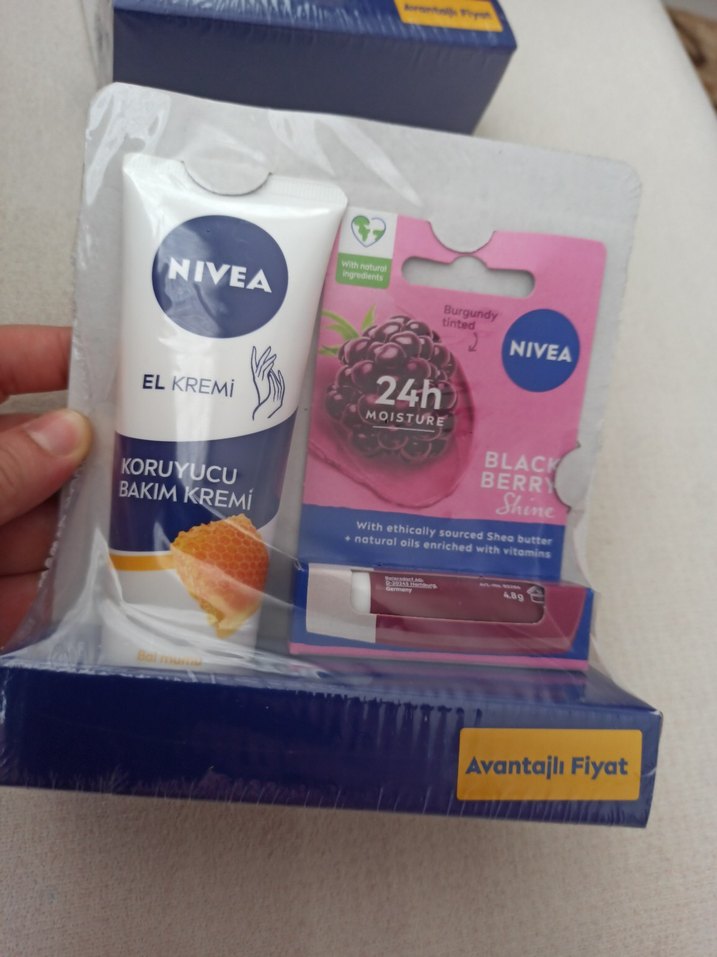 Nivea el kremi koruyucu bakım sağlar, siyah böğürtlen dudak parlatıcısı ise 24 saat nem ve vitamin desteği sunar.