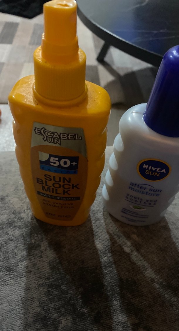 NIVEA güneş sonrası nemlendirici ve Escabel SPF 50+ güneş sütü ile cildinizi koruyun ve nemlendirin. ☀️sarı olan tam dolu nıvea yarımdan biraz fazda
