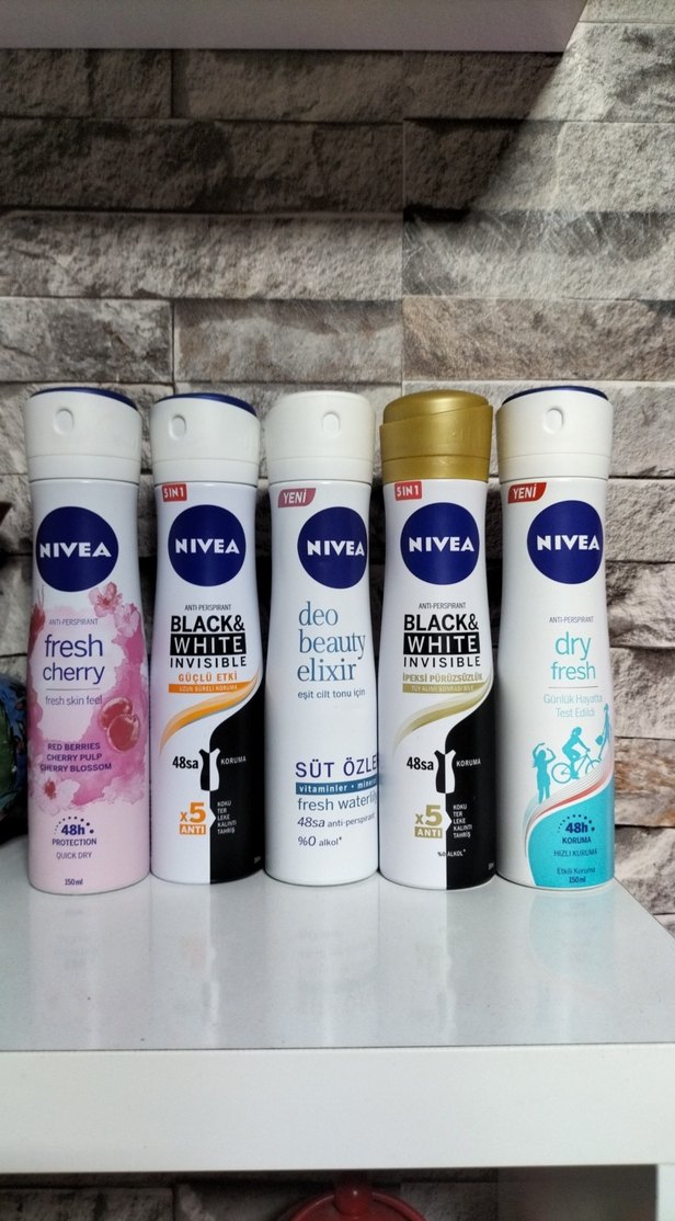 Nivea kadın deodorantları, fresh cherry, dry fresh ve beauty elixir gibi farklı kokularla 48 saat ferahlık sağlar. Black & White formülleri beyaz iz ve sarı lekeye karşı korur. 1adet fiyatidir.