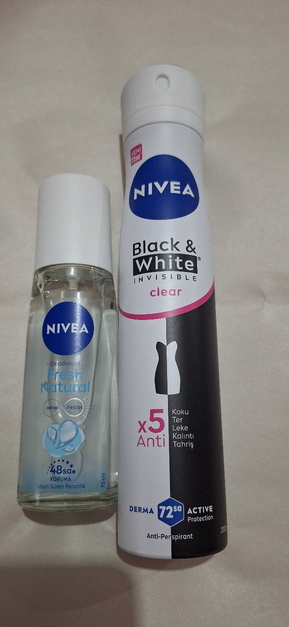 Nivea kadın deodorant seti, koku, ter, leke ve tahrişe karşı 48 saat koruma sağlayan Black & White Invisible Clear sprey ile uzun süre ferahlık sunan Fresh Natural roll-on içerir.