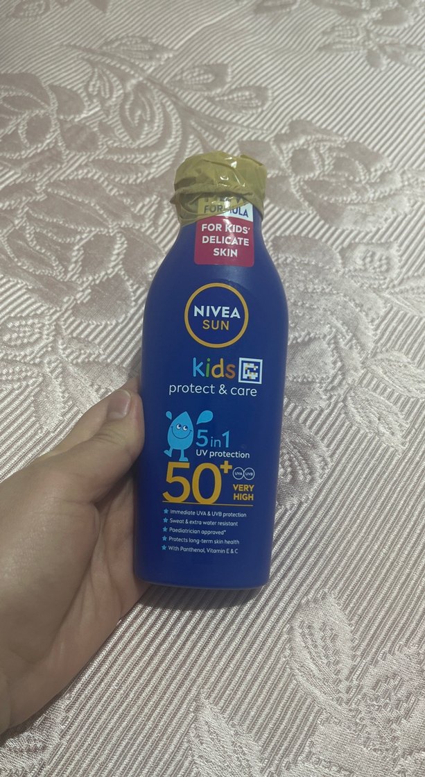 Nivea Sun Kids 5in1, hassas ciltler için SPF 50 çok yüksek koruma sağlar. Suya dayanıklı olup UVA ve UVB ışınlarına karşı korur, Panthenol ve E ile C vitaminleri içerir. ☀️