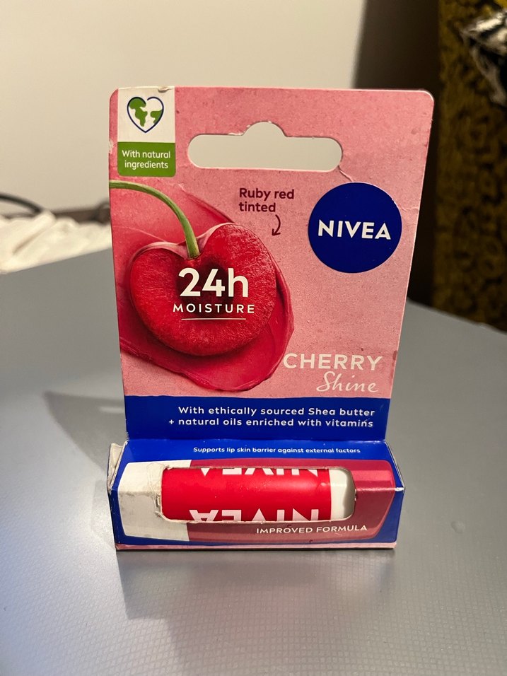 NIVEA Cherry Shine dudak balmı, 24 saat nem sağlar ve kırmızı ışıltı verir. Doğal yağlar, vitaminler ve etik kaynaklı shea yağı ile zenginleştirilmiştir.