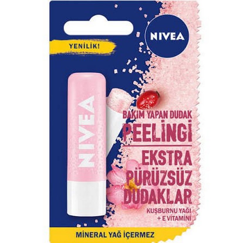 Nivea dudak peelingi, kuşburnu yağı ve E vitamini içerir. Mineral yağ içermez, dudakları ekstra pürüzsüz yapar.