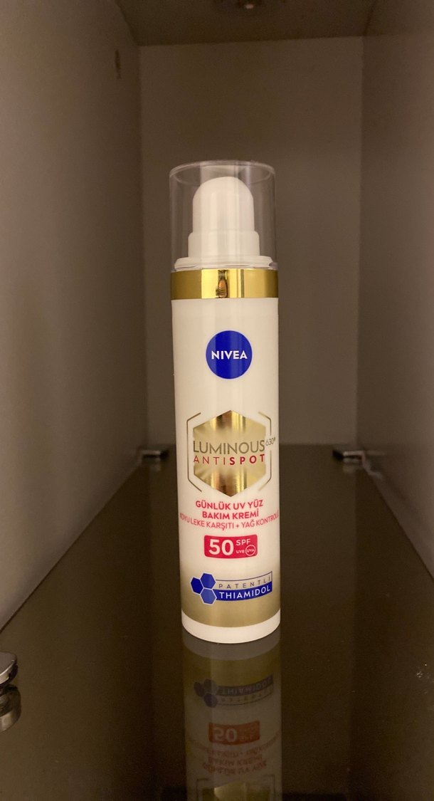 Nivea Luminous Antispot günlük yüz kremi SPF 50 ile UV koruması sağlar ve patentli Thiamidol ile koyu lekeleri azaltmaya yardımcı olur.