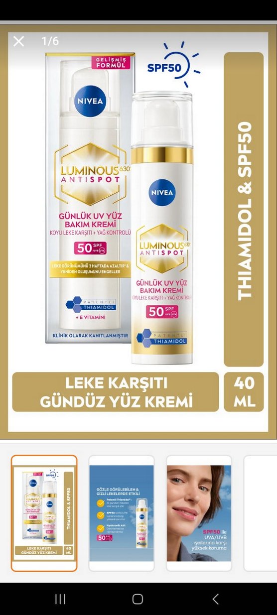 Nivea Luminous630 Antispot gündüz kremi, SPF50 koruma, Thiamidol ve E vitamini içerir. Koyu lekeleri azaltır ve yağ kontrolü sağlar. 40 ml. ☀️bir kez kullanıldı