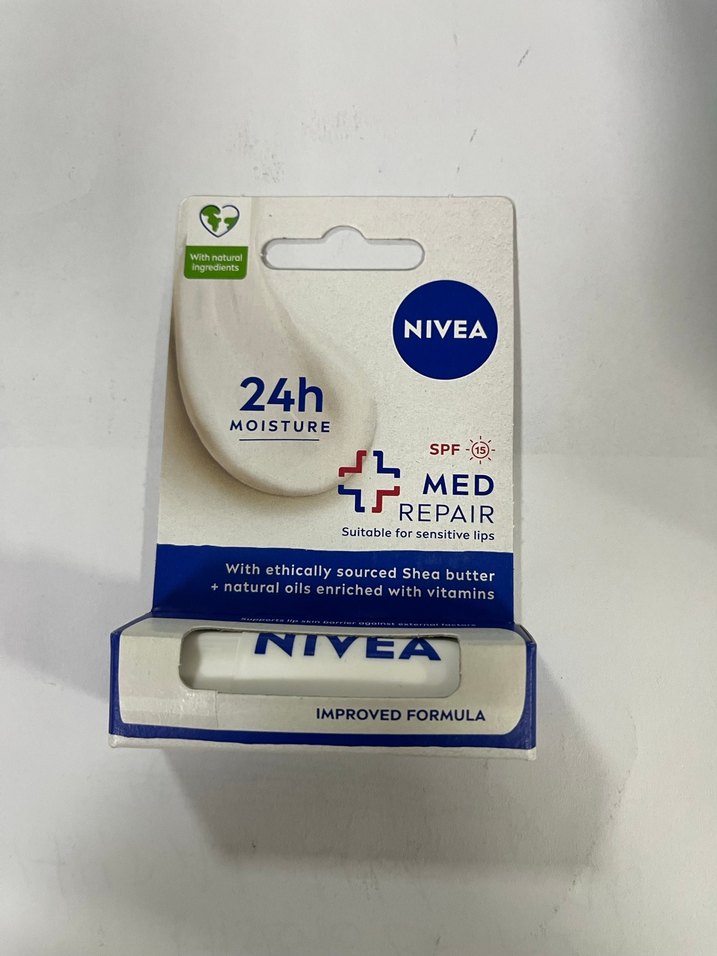 Nivea Med Repair dudak kremi, etik olarak temin edilmiş shea yağı ve doğal yağlarla 24 saat nem sağlar, vitaminlerle zenginleştirilmiştir. Hassas dudaklar için uygundur.