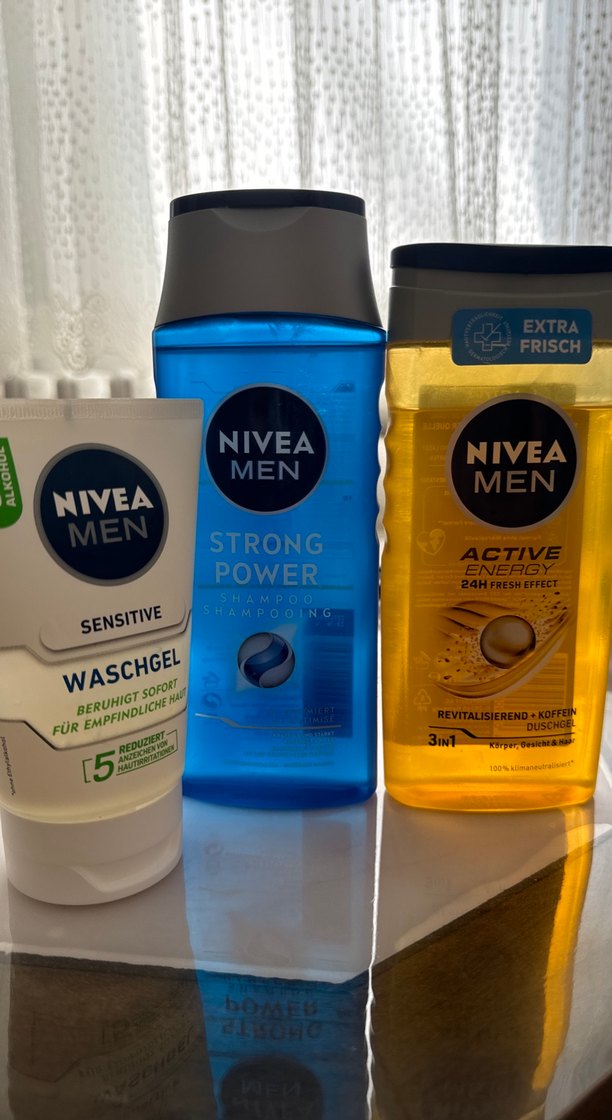 Nivea Men vücut bakım seti; hassas ciltler için yatıştırıcı yıkama jeli, güçlü güç şampuanı ve 24 saat tazelik sağlayan aktif enerji duş jeli içerir.