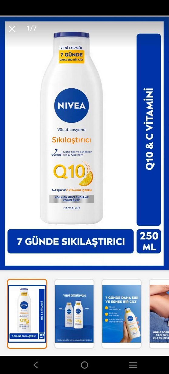 Nivea Q10 ve C vitamini içeren vücut losyonu, 7 günde daha sıkı ve esnek cilt sağlar, 72 saat nemlendirir. Normal ciltler için uygundur.