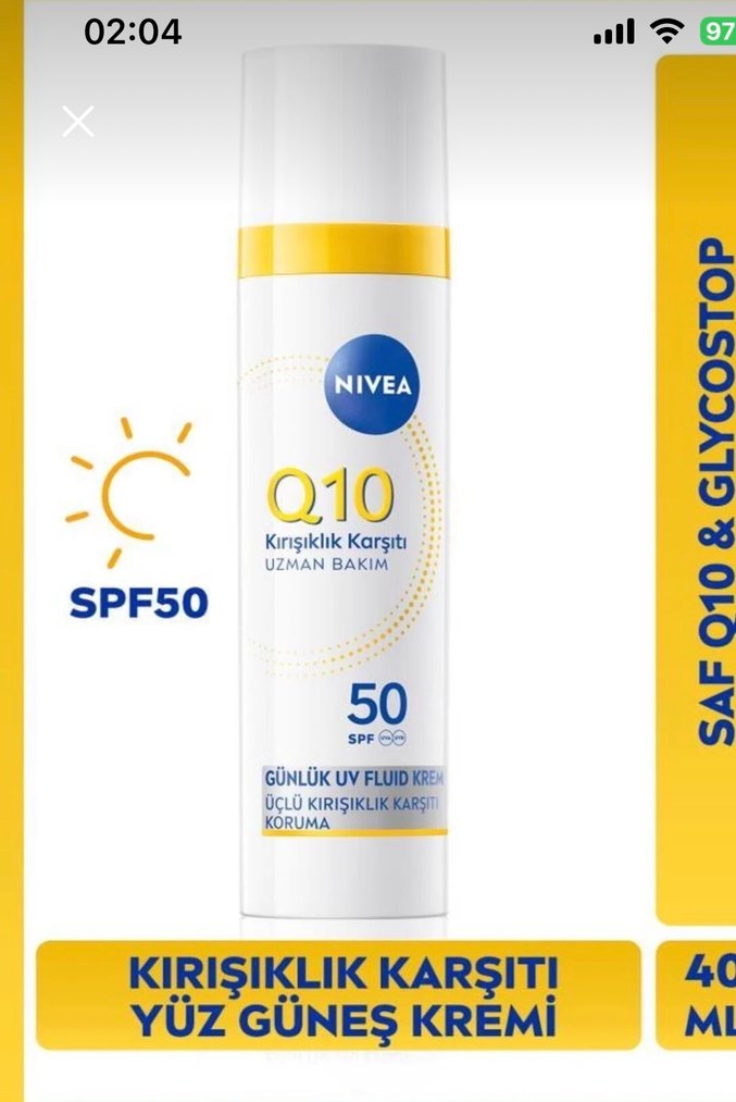 Nivea Q10 kırışıklık karşıtı yüz güneş kremi, SPF50 koruma ve günlük UV koruma sağlar. Cildi korur ve kırışıklıklarla savaşır. ☀️ 1 kez kullanıldı