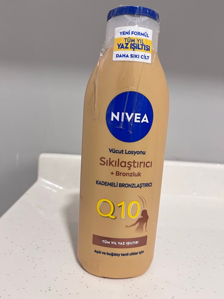 Nivea Q10 sıkılaştırıcı ve kademeli bronzlaştırıcı vücut losyonu. Hafif buğday özü içerir, yaz boyu cildi sıkı ve parlak tutar.