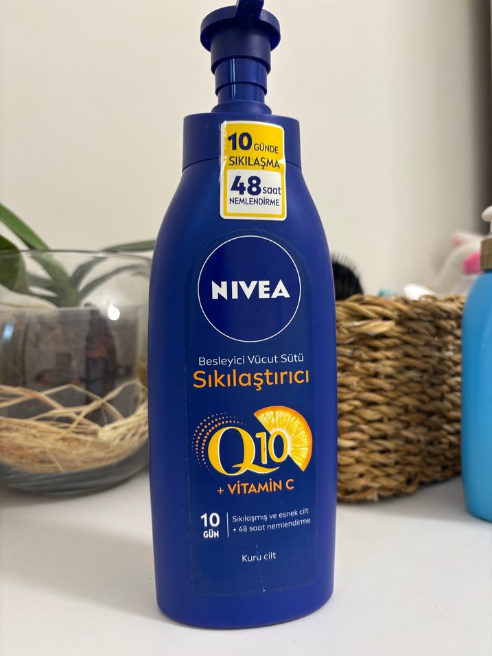 Nivea Q10 + Vitamin C içeren sıkılaştırıcı vücut sütü, kuru cildi besler, 10 günde sıkılaşma ve 48 saat nemlendirme sağlar. Yeni açtım ve 1 kez kullandım