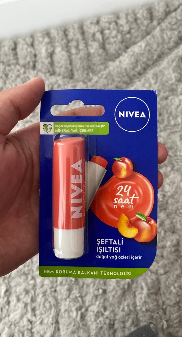 Nivea şeftali aromalı dudak balmı, doğal yağ özleri ve nem koruma kalkanı teknolojisi ile 24 saat nem sağlar. Hafif turuncu ışıltıya sahiptir ve mineral yağ içermez.
