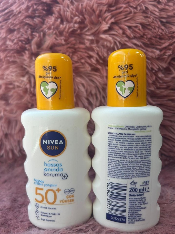 Nivea Sun hassas ciltler için anında yatıştırıcı etkili SPF 50 çok yüksek koruma sağlar. 200 ml şişe %95 geri dönüştürülmüş plastikten üretilmiştir.
