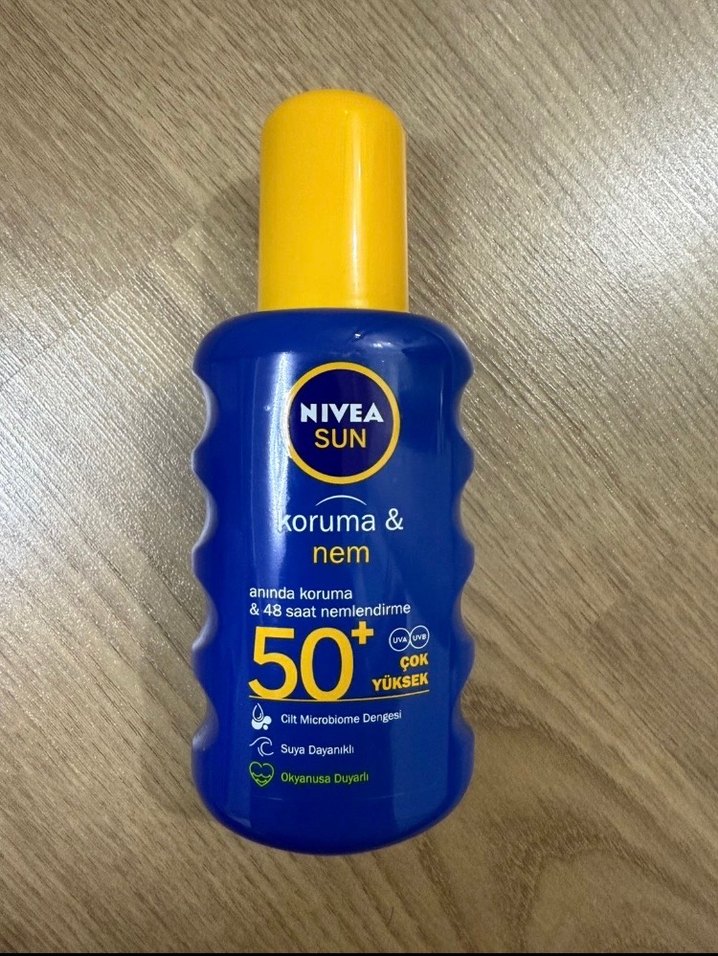 Nivea Sun SPF 50+ güneş spreyi, yüksek koruma ve 48 saat nemlendirme sağlar. Cilt mikrobiyomu dengesini destekler, suya dayanıklıdır ve okyanus dostudur. ☀️ %60 i doludur