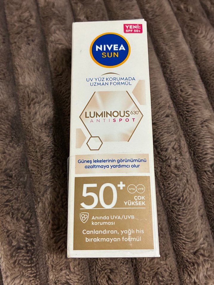 Nivea Sun Luminous630 Antispot SPF 50+ çok yüksek UVA/UVB koruması sağlar ve güneş lekelerinin görünümünü azaltmaya yardımcı olur. Canlandırıcı, yağlı his bırakmayan formüle sahiptir. ☀️