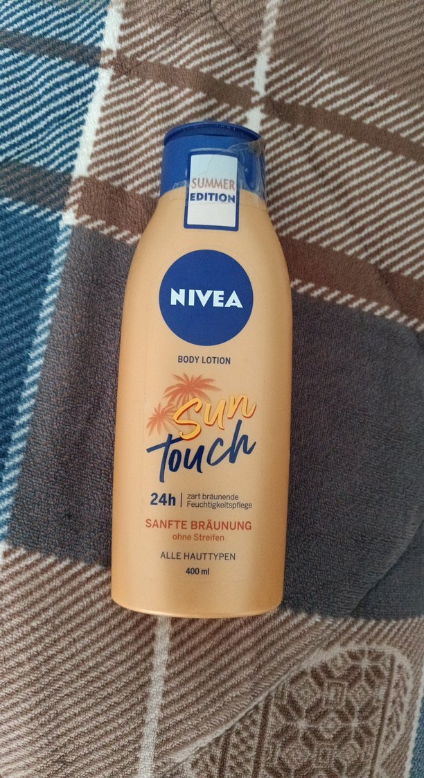 Nivea Sun Touch vücut losyonu, tüm cilt tipleri için nazik bronzlaşma ve 24 saat nem bakımı sağlar, iz bırakmaz. 400 ml yaz serisi ürünü. ☀️
