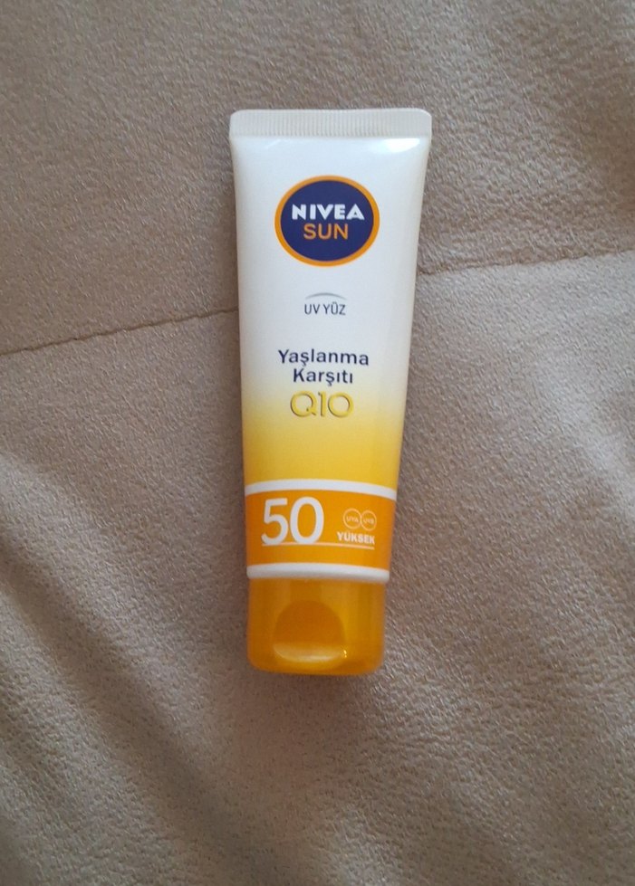 ((İçini göremedim ne kadarı duruyor bilmiyorum, yarısı duruyor gibi.)) Nivea Sun yaşlanma karşıtı Q10 içerikli yüz kremi, yüksek SPF 50 ile UV ışınlarına karşı koruma sağlar. Güneşin yaşlanma etkilerine karşı cildi korur. ☀️