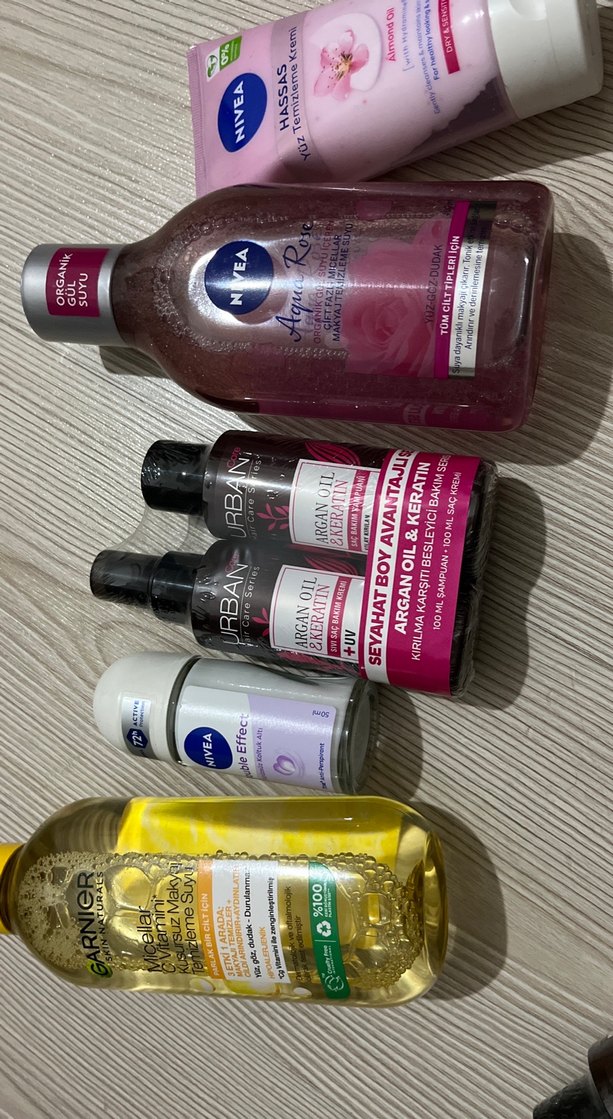 Nivea Aqua Rose şampuan, Urban Argan Oil & Keratin saç serumu, Nivea deodorant ve Garnier saç yağı içeren bakım seti. Saç ve cilt için nemlendirme ve onarım sağlar.