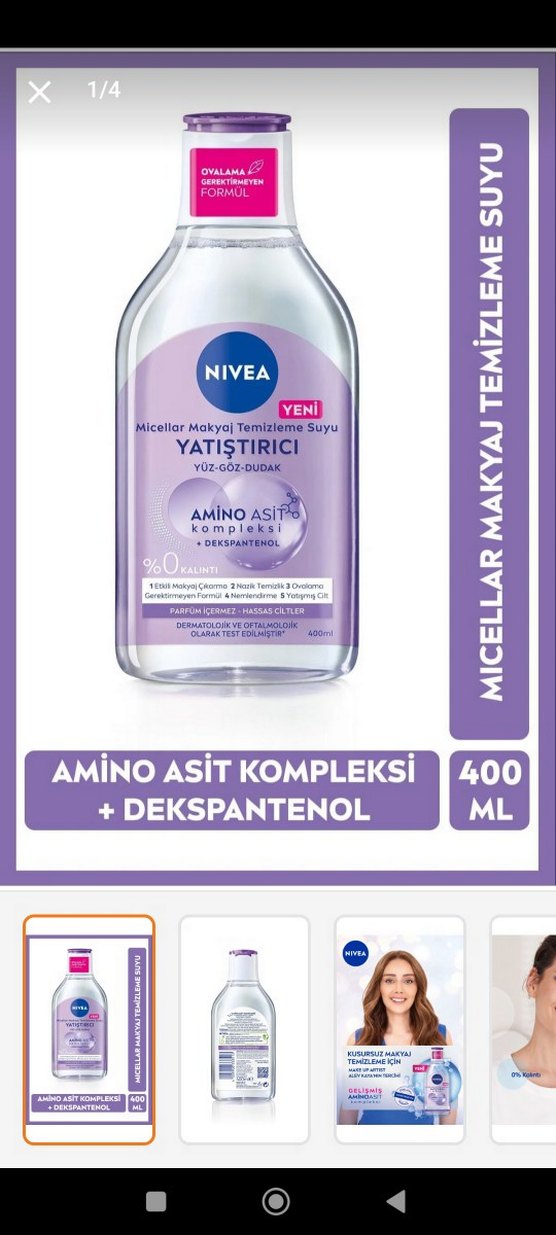 Nivea yatıştırıcı micellar makyaj temizleme suyu, amino asit kompleksi ve dekspantenol içerir. Yüz, göz ve dudak için uygundur, 400 ml.