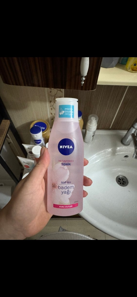 Nivea yatıştırıcı tonik, kuru ciltler için saf su ve badem yağı içerir, cildi nazikçe dengeler ve tazeler.