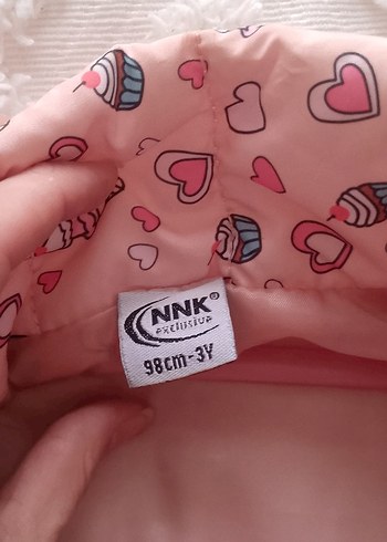 Pastel pembe renkte, kalpli ve cupcakeli baskılı, yumuşak sentetik kumaştan yapılmış 98 cm boyutunda çocuk şişme yelek Marka: NNK Exclusive.