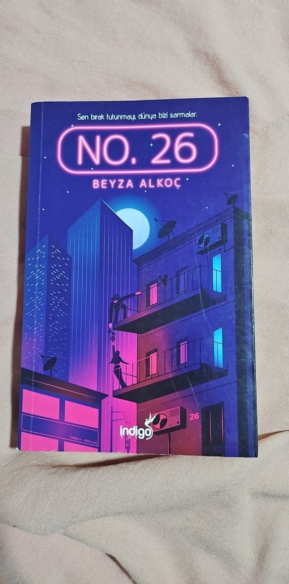Beyza Alkoç'un No. 26 adlı romanı, gece manzaralı modern binalar ve ay ışığı altında gizemli bir atmosfer sunuyor. Sararmış ve çizilmiş yerler var