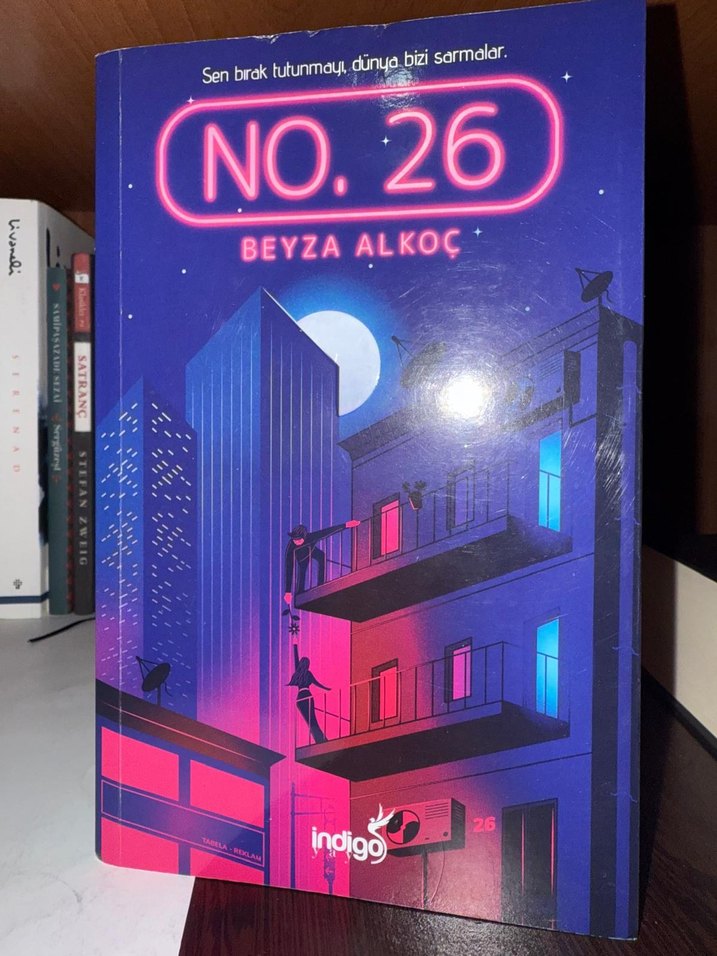 Beyza Alkoç'un No. 26 adlı romanı, neon ışıklar ve gece manzarasıyla modern bir şehir görünümüne sahip. Indigo yayınevinden.