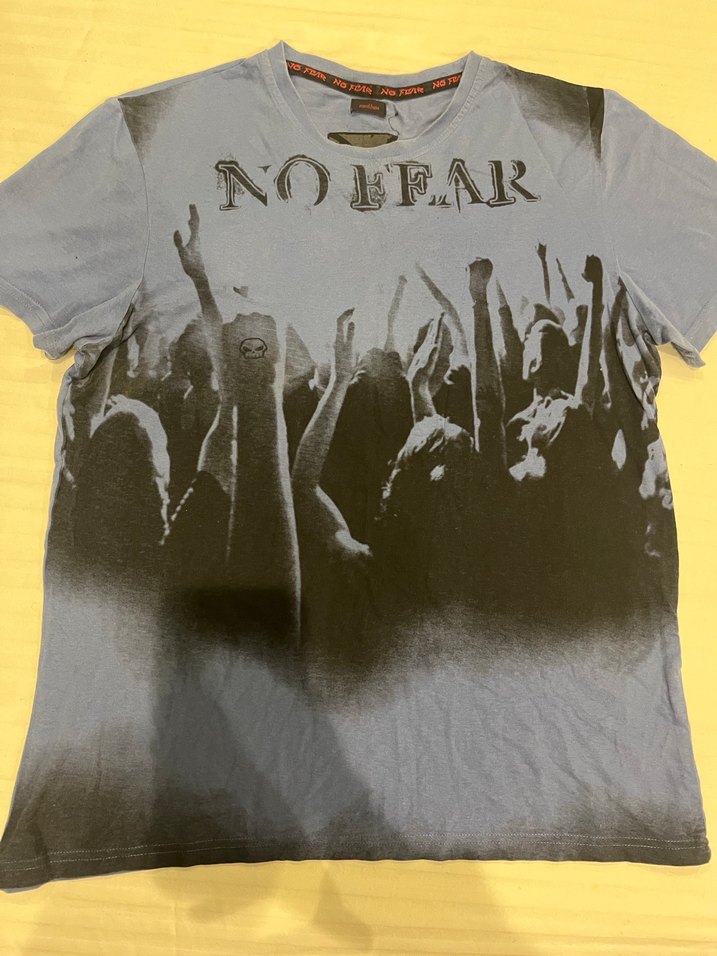 Gri renkli, kısa kollu, bisiklet yaka tişört. "NOFEAR" yazılı ve kalabalık baskılı, denim kumaştan, bol kesim. Rock punk tarzı ve parti için uygun. Arka kısmında etiketinden kaynaklı hafif sökülme mevcut.
