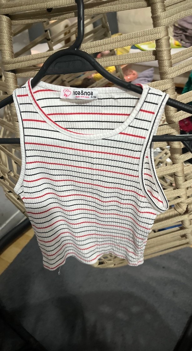 Noa&Noa markalı, beyaz ve kırmızı çizgili, kısa kesim, kollu olmayan, tekne yaka ve örme dokulu atlet. Rahat ve şık sokak stili için uygundur.