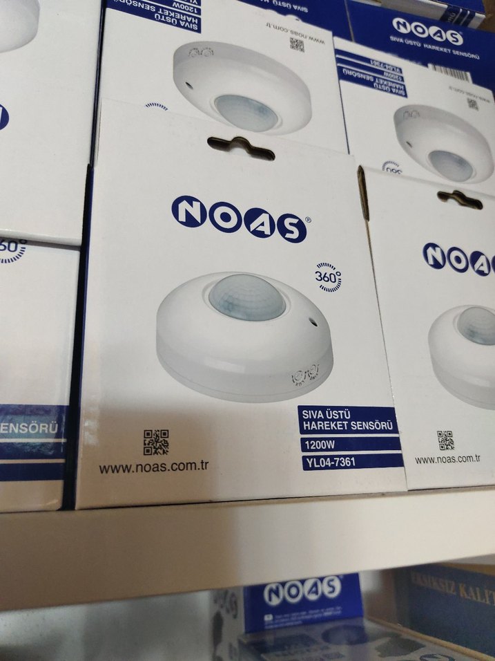 NOAS beyaz renkli tavan üstü hareket sensörü, 1200W güç kapasitesine ve 360° algılama özelliğine sahiptir. Hareket tespiti için uygundur.