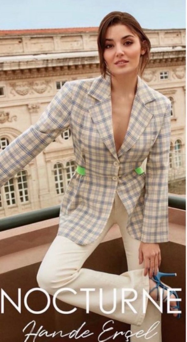 Sayfamda hem altını hem üstünü bulabilirsiniz artık üretilmeyen ve bulunmayan Hande ve Gamze Erçelin tercihi Bej ekose desenli midi blazer ceket, düğmeli ve kesik yaka detaylıdır. Sentetik kumaştan üretilmiş, regular fit ve askılı kolludur. Ofis için uygundur.