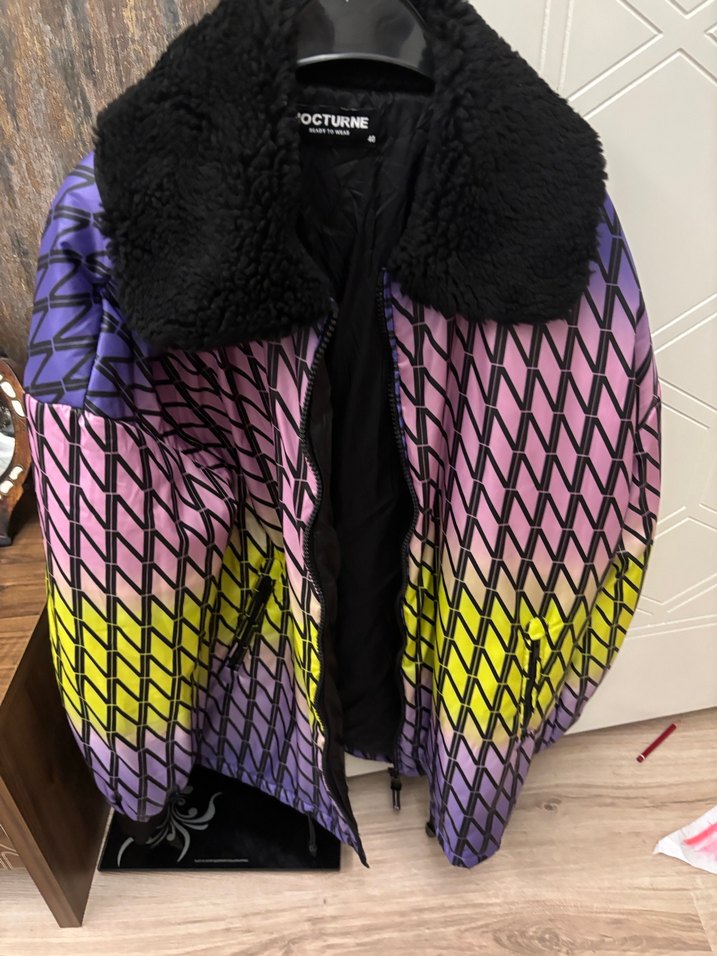 OCTURNE markalı, çok renkli tie-dye desenli, sentetik kumaştan, bol kesim midi kaban. Kürklü yakası ve askılı kolları vardır.