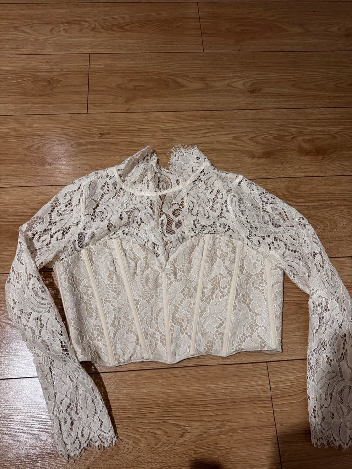 Bu beyaz bluz, uzun dantel kollara, yüksek yakaya ve nakışlı örme kumaşa sahip olup, vintage bohem tarzını yansıtarak düğünler için uygundur.