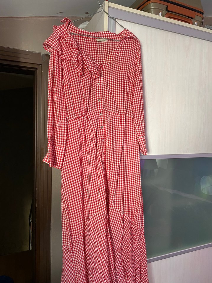 Hafif kırmızı uzun elbise, bol kesim, uzun kollu ve V yaka fırfır detaylıdır. Ekoseli desene sahip, sentetik kumaştan yapılmıştır, günlük kullanıma uygundur.