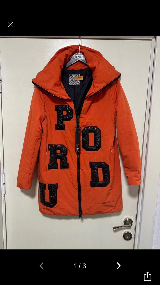 Turuncu renkli, fermuarlı önü ve baskılı detaylarıyla, uzun kollu, normal kesim midi kadın ceket. Sokak stili ve günlük kullanım için uygundur.