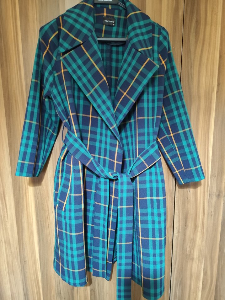 Kadınlar için uzun, kuşaklı, mavi kareli kaban. Çentikli yaka ve uzun kollu, sentetik kumaştan yapılmıştır. Günlük kullanım için uygundur. Terzide işlem görmüştür,daraltmistim. S bedene uyumludur