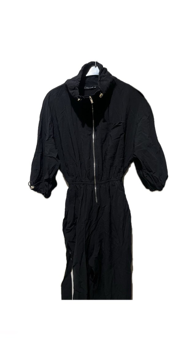 Kadın siyah keten uzun tulum, yüksek yakalı, kısa kollu ve bol kesimdir. Fermuarlı önde ve minimalist sokak stiliyle günlük kullanıma uygundur.