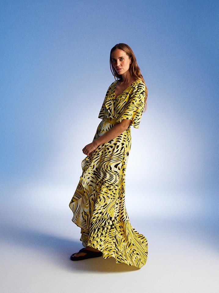Sarı zebra desenli, bol kesim ve drapeli uzun elbise. V yaka ve askılı kollu, ipeksi dokulu, günlük kullanıma uygun bohem tarzda.