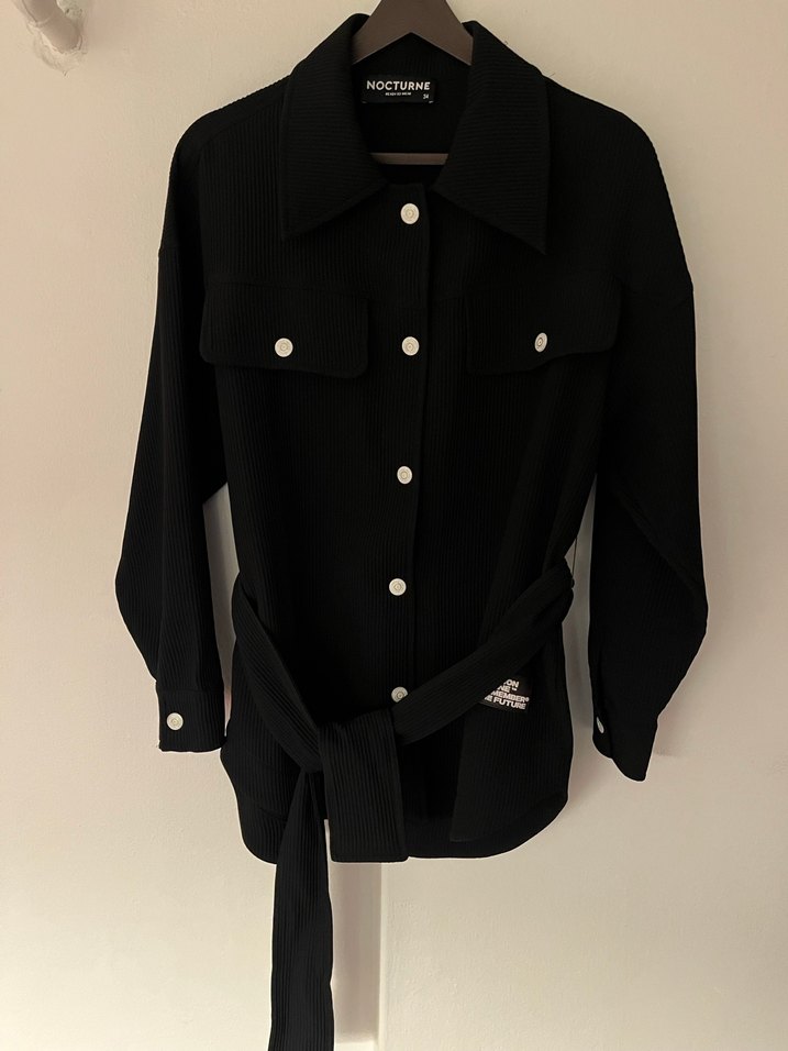 Nocturne siyah düğmeli midi ceket, uzun kollu ve kesik yakalı. Rahat kesim, yumuşak ve sıcak kumaştan, günlük sokak stiline uygun.