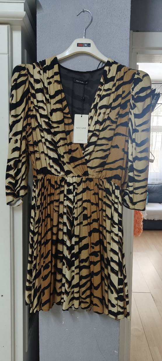 nocturne Kahverengi tonlarında sentetik kumaştan üretilmiş, uzun kollu, V yakalı, piliseli ve bol kesimli zebra desenli uzun kadın elbisesi. Sokak modasına uygun şık bir parça.