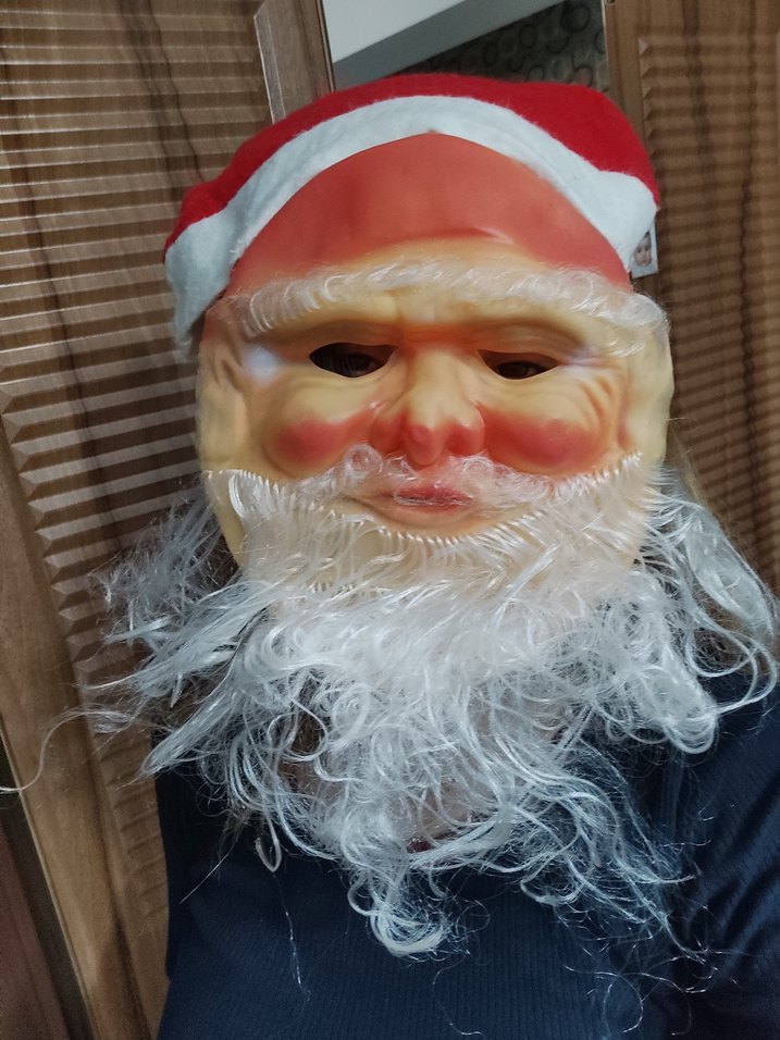 Kırmızı şapkalı ve beyaz kıvırcık sakallı Noel Baba maskesi, tüm yüzü kaplar.
